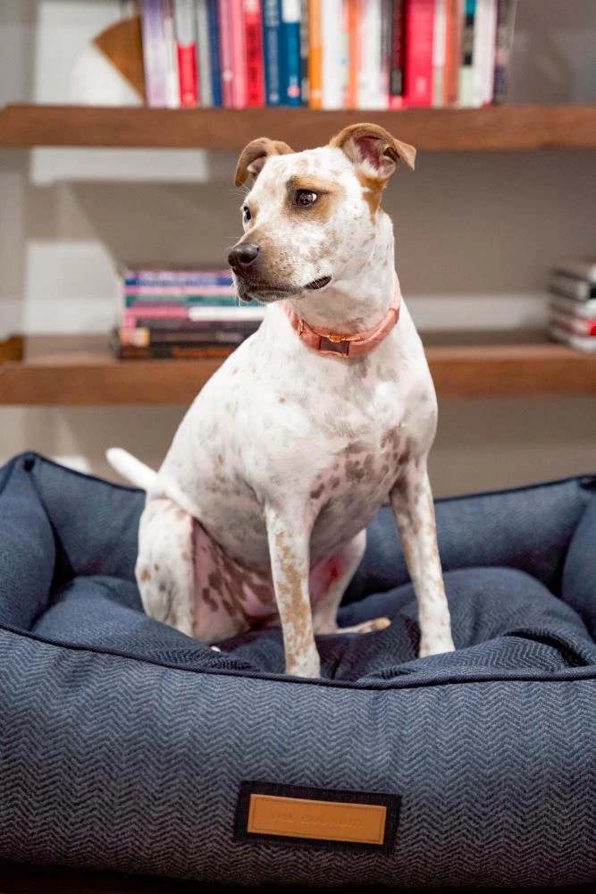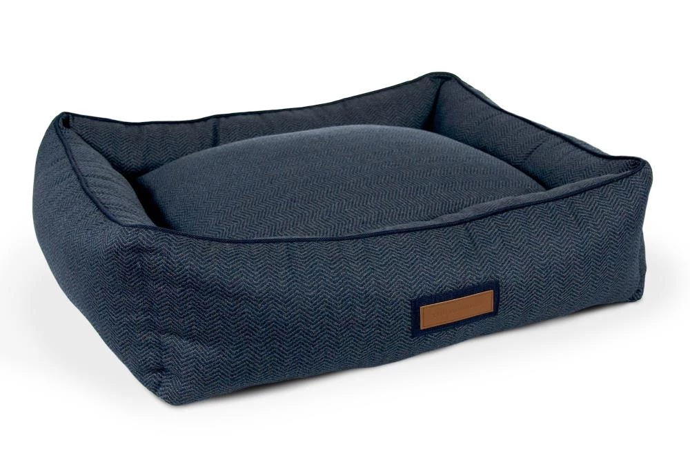 Snuggle much? For dogs that love to burrow behind cushions on the sofa, or disappear under the blankets on the bed, the Hugger makes a wonderful choice. Bolstered on all four sides, your hound is sure to find a comfortable corner to snuggle up to. The Hugger is our fluffiest, coziest bed. It’s over-stuffed with a proprietary fill made from recycled plastic water bottles that gives just the right amount to provide support and bounces back use after use. The menswear inspired navy herringbone Sunbrella fabric is soft to the touch, durable, resists moisture, and is washable. There is simply no better fabric choice for a pet bed. Each piece is made by hand in the USA and begins manufacturing the day you place your order. Thoughtfully designed with your dog and your home in mind, the Hugger bed performs as good as it looks.??We recommend measuring your sleeping pet to find the perfect bed size. Pets who curl up to sleep can fit on a smaller bed, while those who stretch out need a larger bed. To determine the ideal bed length, measure your pet in their typical sleeping position, then add 6-10” for the final bed size. When in doubt, we suggest ordering the size up. Please double check that you have chosen the correct size before placing your order.??Small: 24 in. x 18 in. x 7 in. high (dogs less than 30 lbs)?Medium: 30 in. x 25 in. x 8 in. high (dogs 30-60 lbs)?Large: 38 in. x 25 in. x 8 in. high (dogs 60-90 lbs)?X-Large: 44 in. x 36 in. x 10 in. high (dogs over 90 lbs)