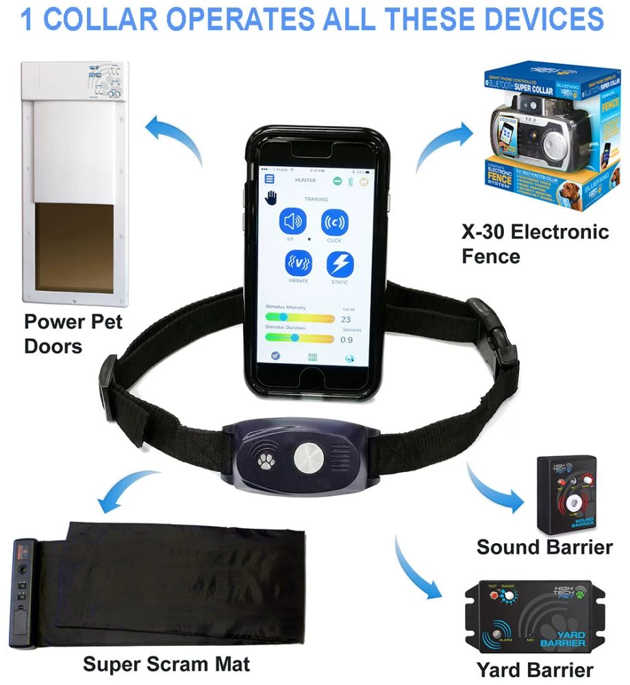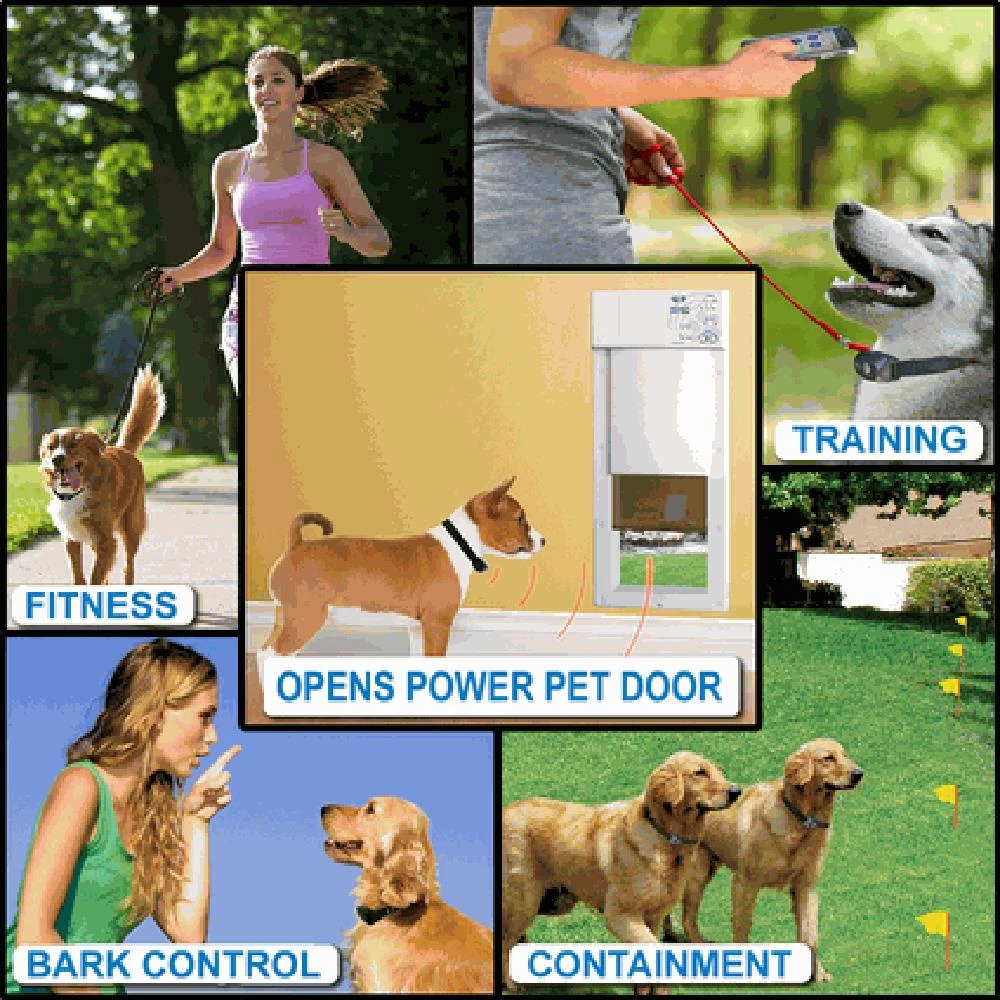- 5 COLLARS in 1: operates Power Pet door, sonic barriers and super scram mat, remote training, bark control, containment, activity and fitness tracking
