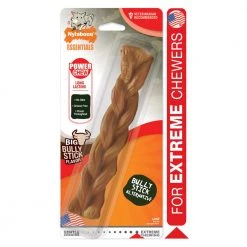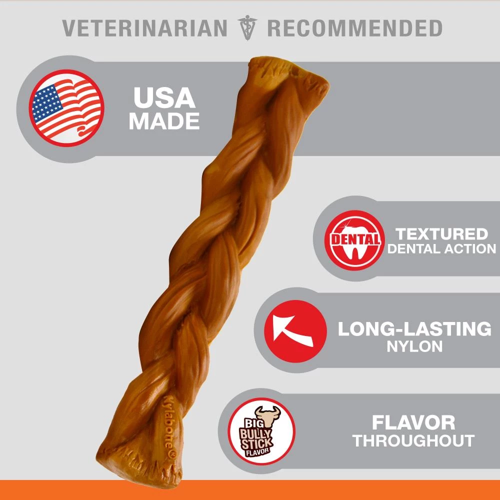 For over 60 years, Nylabone has been creating dog chew toys in a variety of shapes, textures, and sizes to satisfy every fur pal. From our unique line of Natural Alternatives, this Power Chew Braided Bully Stick Alternative is cleaner and safer than real bully sticks and offers all the same benefits—with no grease or odor. Its authentic braided shape and savory, calorie-free bully stick flavor will indulge your dog’s craving for real animal parts. Created just for power chewers, this long-lasting dog chew toy is made of durable nylon. It will help discourage destructive chewing, satisfy your furry friend’s instinctive chewing urge, and keep them entertained. Plus, this USA-made Power Chew features a subtle textured surface that promotes dog oral health by naturally helping clean teeth and freshen breath as your best friend chews! This large dog chew toy is created for dogs up to 50 pounds.