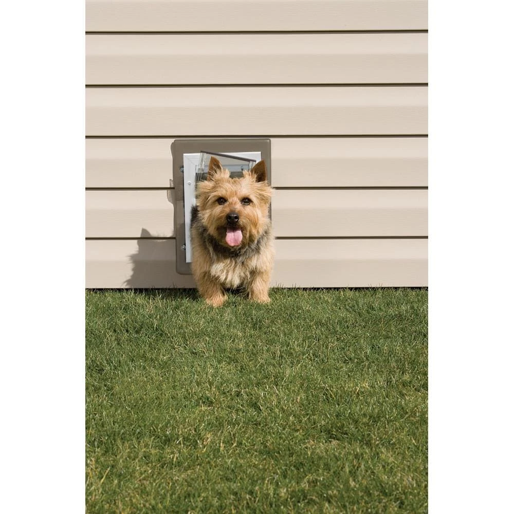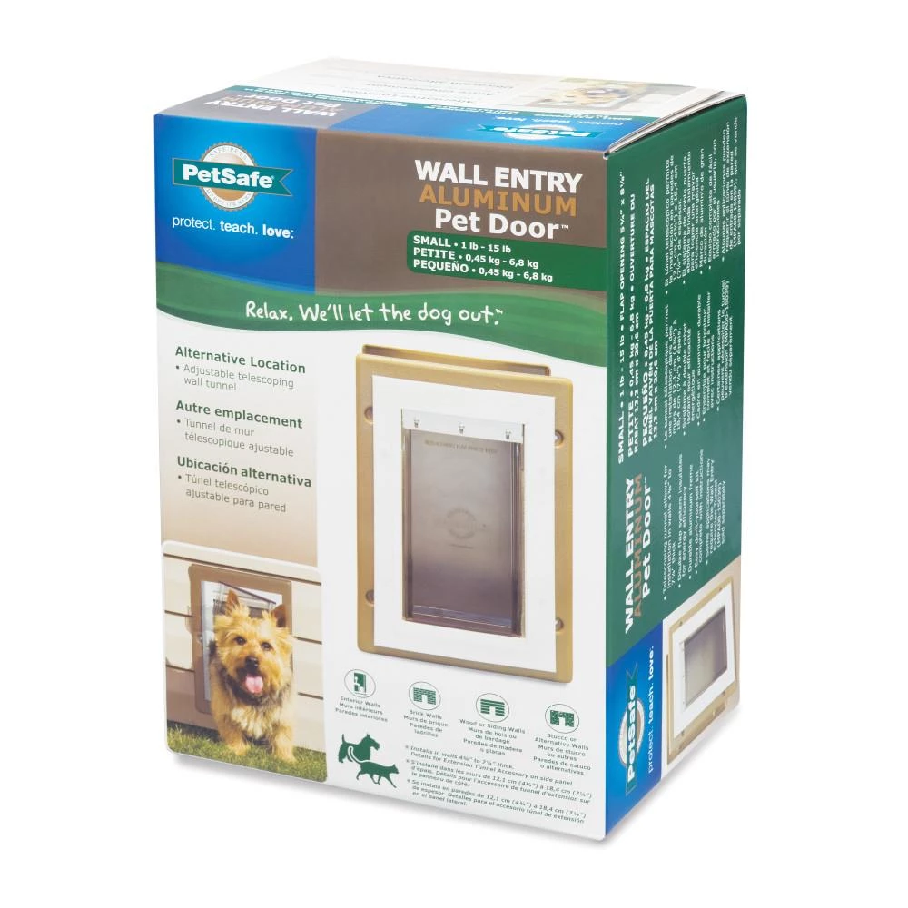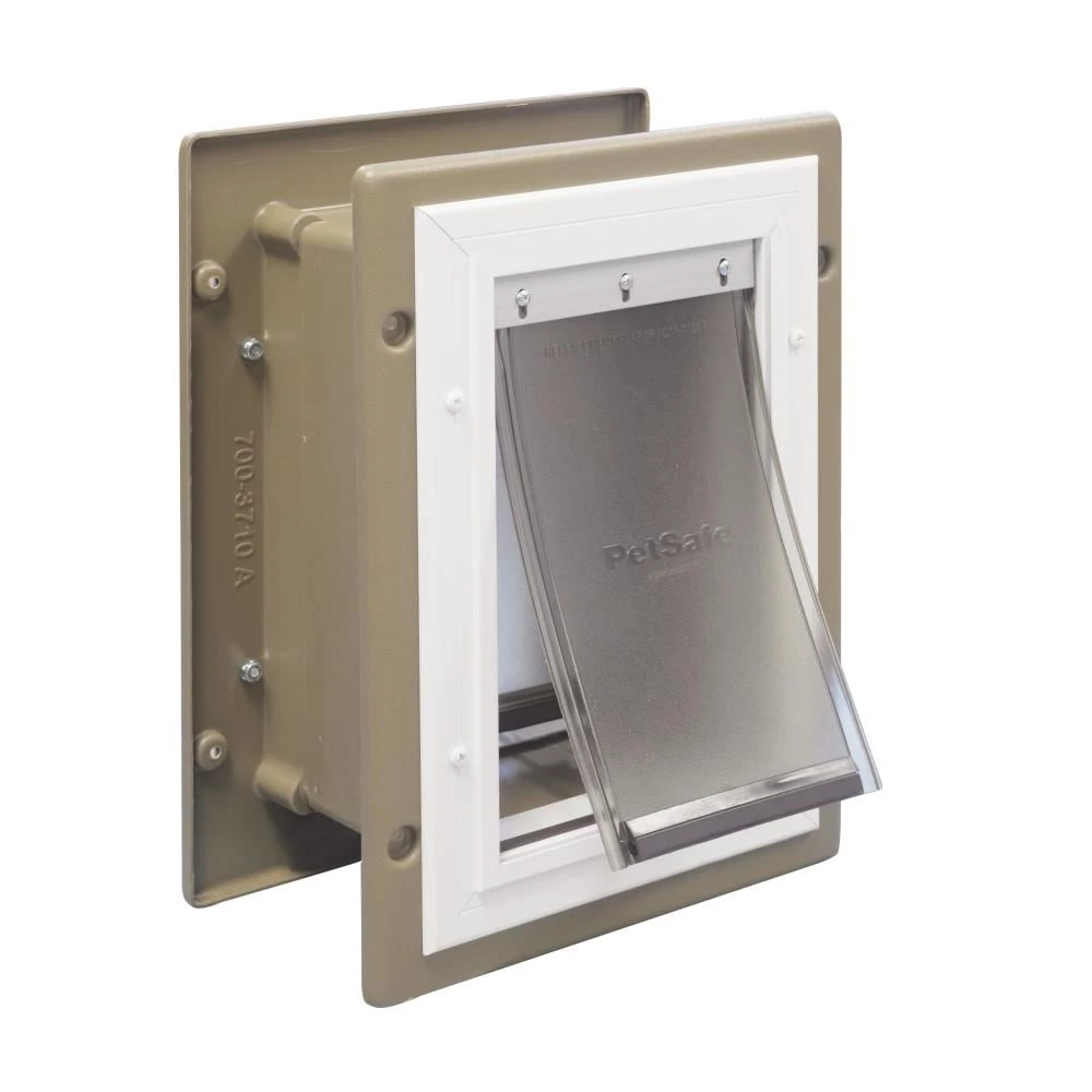 The PetSafe® Wall Entry Aluminum Pet Door allows your pet to go in and out without the hassle of constantly having to open the door. This door is great for homes in which installing a pet door on an entry or side door is simply not practical or convenient. This unique wall entry pet door can be installed in a number of different wall materials including all types of siding, stucco, and brick; making it one of the best wall mount dog doors on the market. The telescoping tunnel allows for installation into walls that are 4.75 in. to 7.25 in. thick. For extra thick walls that extend beyond 7.25 in., there are extension kits sold separately that will enable the door to extend further.