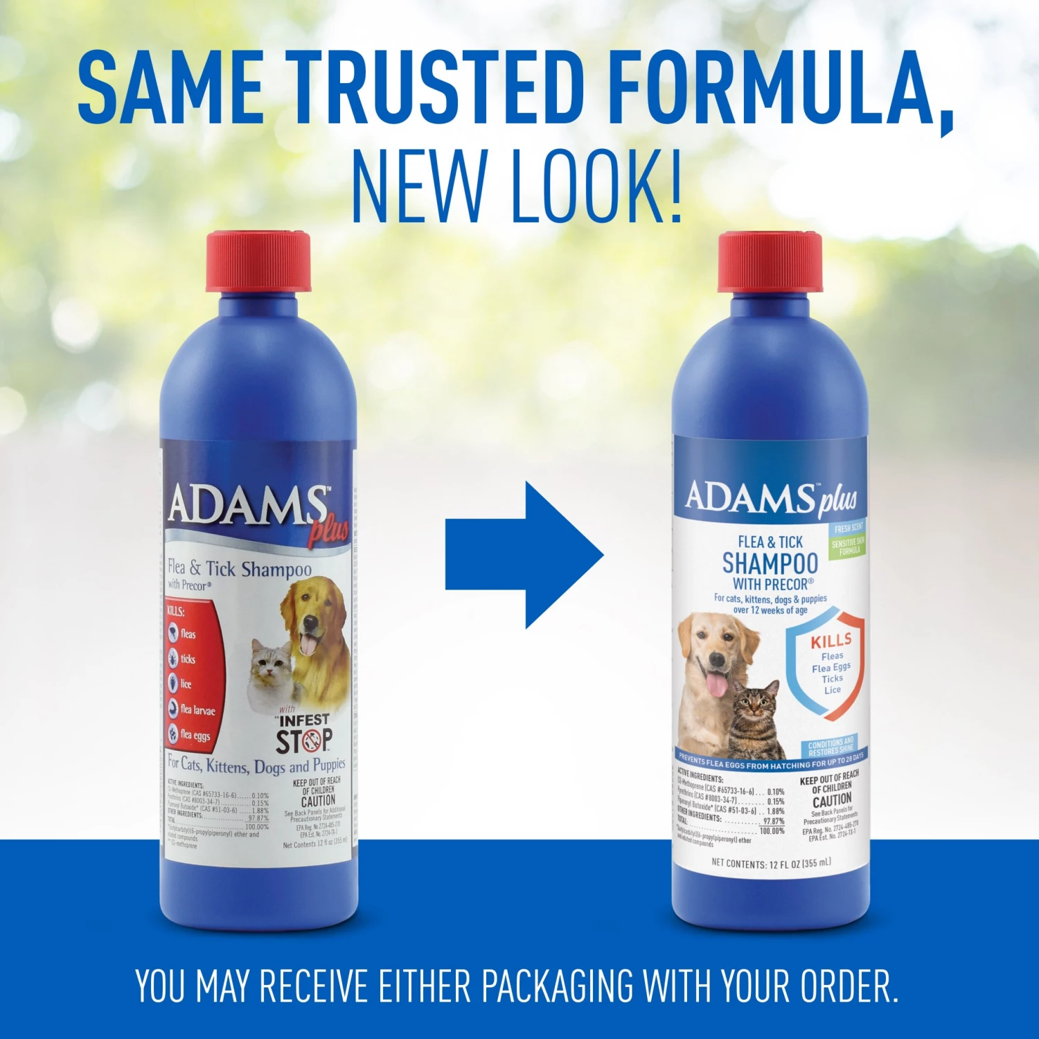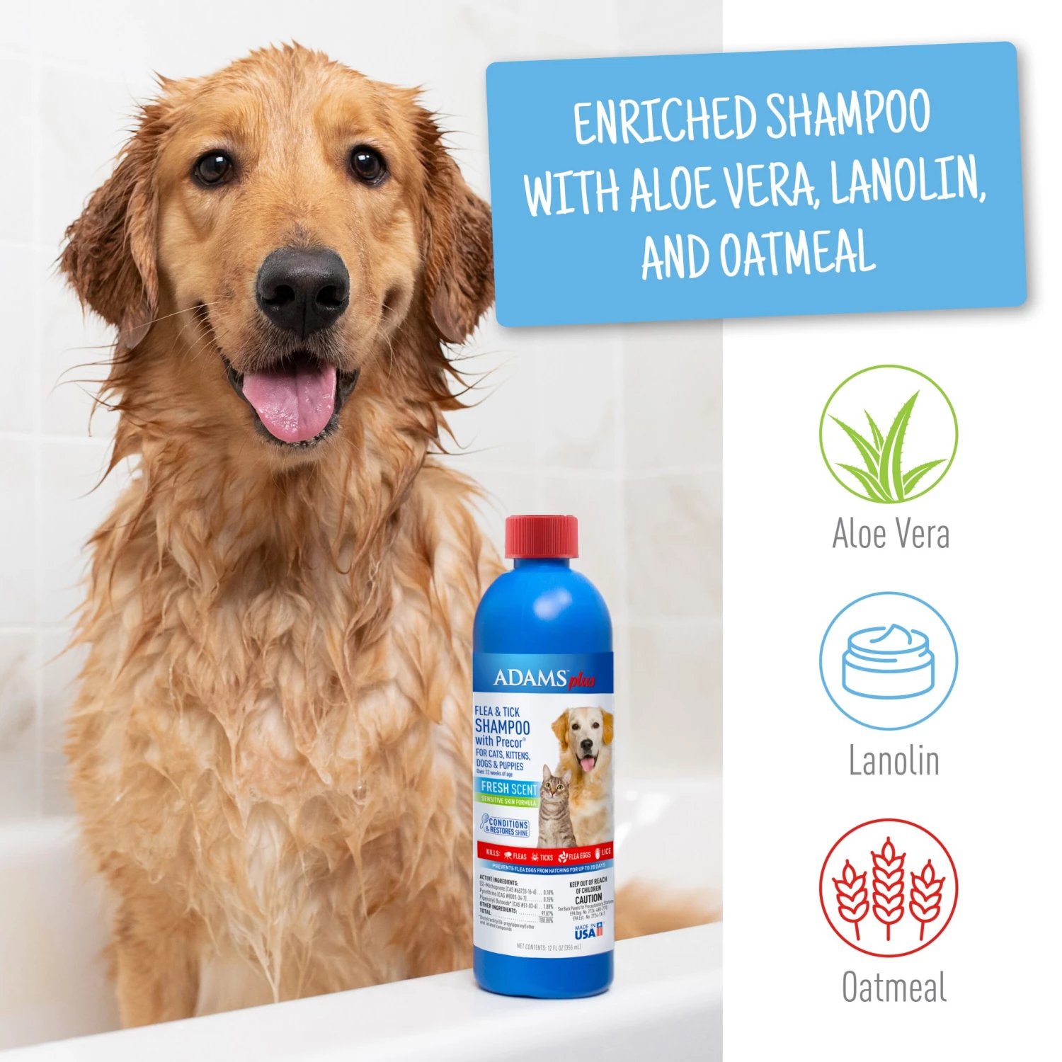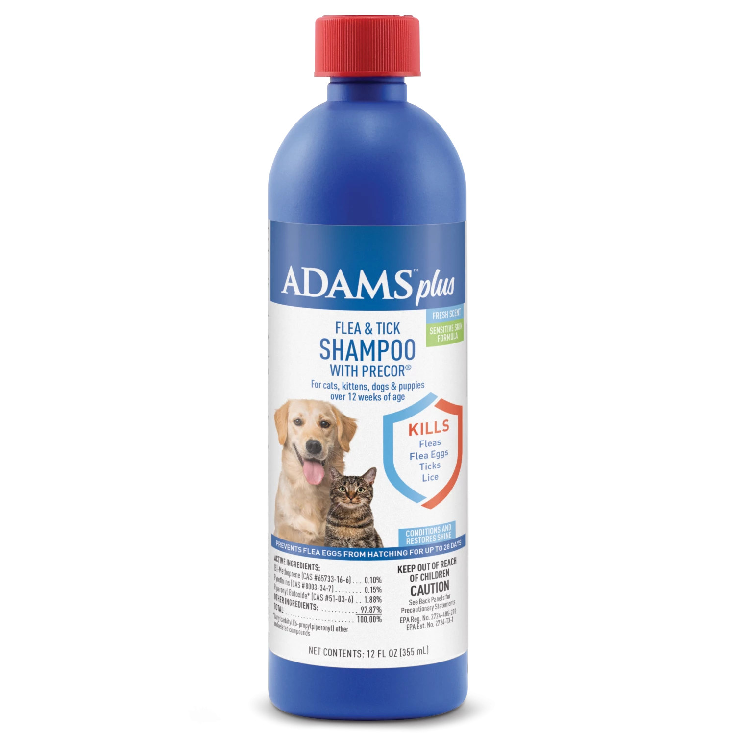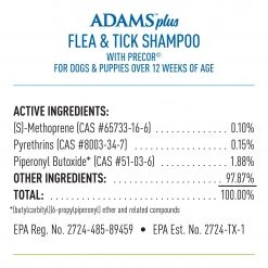 Adams plus flea and tick shampoo with Precor is a sensitive skin flea and tick shampoo that kills fleas, ticks, and lice on contact. Our rich, creamy formula cleans and conditions your pet’s coat leaving it soft, shiny, and manageable. It’s enriched with soothing aloe Vera, lanolin, and oatmeal with a pleasant, fresh scent while controlling flea re-infestation for up to 28 days.