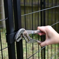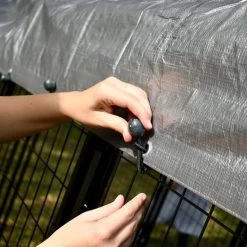 Pet Sentinel 6 ft H x 4 ft W x 8 ft D welded steel kennel kit with cover features an 8 gauge welded wire construction that provides a durable and long lasting kennel for your pet. The welded wire undergoes a galvanization process and is then finished with a powder coating to aid in rust prevention and extend the life of the kennel. The strong round tube design accepts kennel covers (cover included) and the 1 In. leg clearance provides an easy cleanup. Ground anchors included for added kennel stability. All hardware needed for assembly is included.