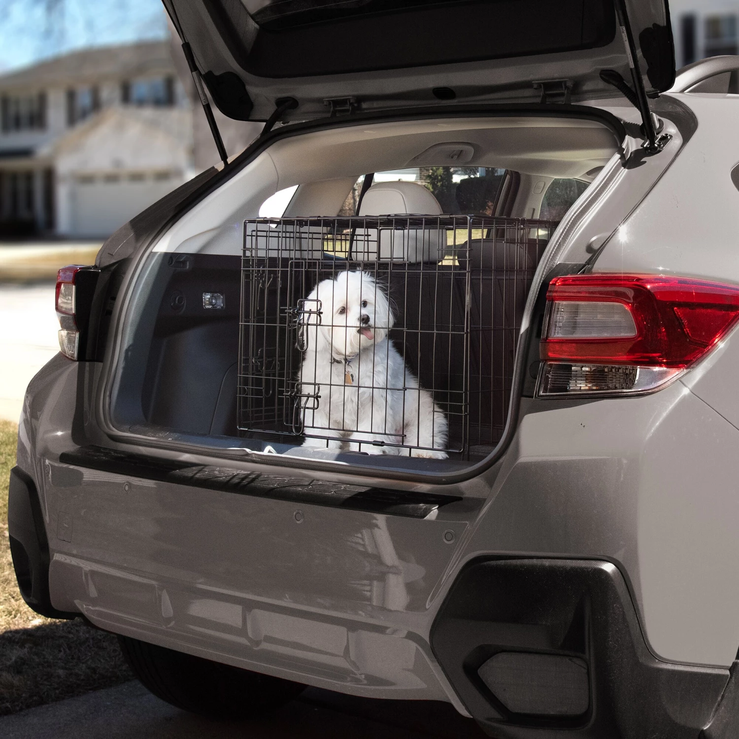 Make traveling with and training your pet easier using a Pet Essentials wire crate. Assembly is as easy as unfolding the crate and snapping into place. Then it collapses quickly for travel and storage. Two doors make it easy to get your pet in and out, no matter which direction you have to place the crate. And two latches on each door adds to your peace of mind. The included removable tray makes cleaning easy, plus it keeps your pets paws comfortable. Each crate comes with a removable wire divider to help with house training young pups. Removable rubber fee will protect your indoor surfaces from scratches.