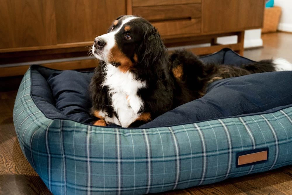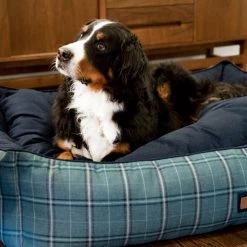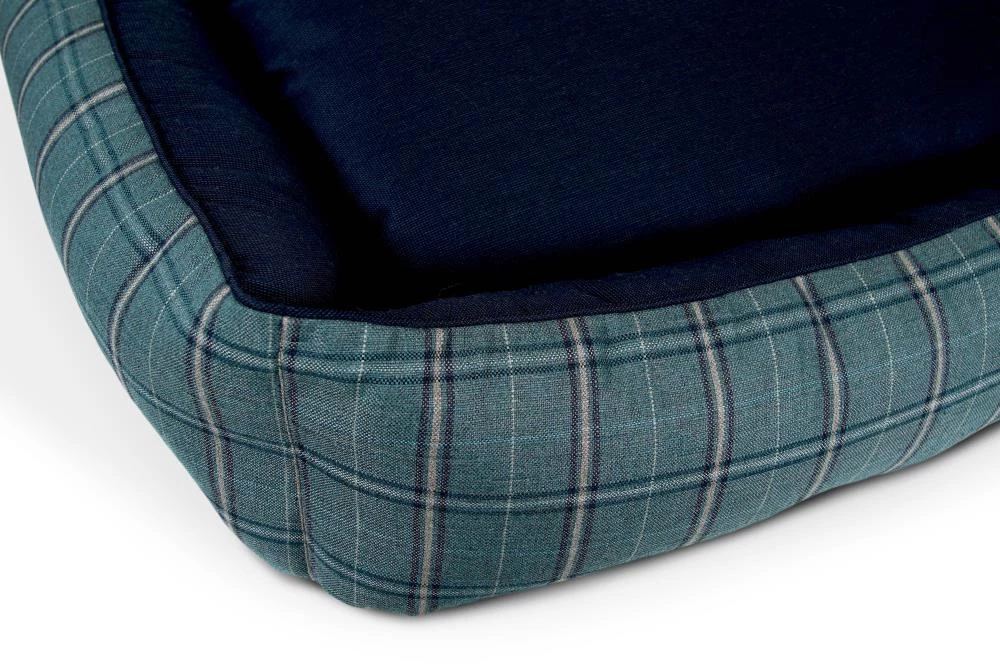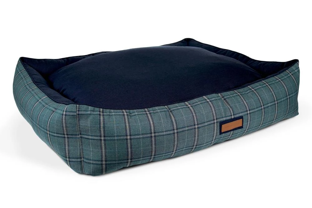 Snuggle much? For dogs that love to burrow behind cushions on the sofa, or disappear under the blankets on the bed, the Hugger makes a wonderful choice. Bolstered on all four sides, your hound is sure to find a comfortable corner to snuggle up to. The Hugger is our fluffiest, coziest bed. It’s over-stuffed with a proprietary fill made from recycled plastic water bottles that gives just the right amount to provide support and bounces back use after use. Sewn in rich teal and navy Sunbrella fabrics, with a vintage plaid pattern, that are soft to the touch, durable, resist moisture, and are washable. There is simply no better fabric choice for a pet bed. Each piece is made by hand in the USA and begins manufacturing the day you place your order. Thoughtfully designed with your dog and your home in mind, the Hugger bed performs as good as it looks.??We recommend measuring your sleeping pet to find the perfect bed size. Pets who curl up to sleep can fit on a smaller bed, while those who stretch out need a larger bed. To determine the ideal bed length, measure your pet in their typical sleeping position, then add 6-10” for the final bed size. When in doubt, we suggest ordering the size up. Please double check that you have chosen the correct size before placing your order.??Small: 24 in. x 18 in. x 7 in. high (dogs less than 30 lbs)?Medium: 30 in. x 25 in. x 8 in. high (dogs 30-60 lbs)?Large: 38 in. x 25 in. x 8 in. high (dogs 60-90 lbs)?X-Large: 44 in. x 36 in. x 10 in. high (dogs over 90 lbs)