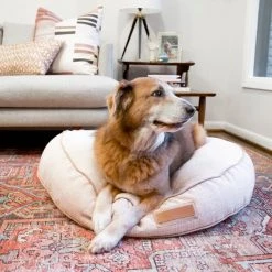 Have a dog who’s a freestyle sleeper? On their back one minute, belly the next, curled into a donut a minute later? Our round bed takes on all comers. Plush and responsive, the Round bed refuses to clump or flatten. It’s over-stuffed with a proprietary fill made from recycled plastic water bottles that gives just the right amount to provide support and bounces back use after use. Tailored in a beautiful blush Sunbrella fabric, with a modern textured pattern, that is soft to the touch, durable, resists moisture, and is washable. There is simply no better fabric choice for a pet bed. Each piece is made by hand in the USA and begins manufacturing the day you place your order. Thoughtfully designed with your dog and your home in mind, our round bed performs as good as it looks.??We recommend measuring your sleeping pet to find the perfect bed size. Pets who curl up to sleep can fit on a smaller bed, while those who stretch out need a larger bed. To determine the ideal bed length, measure your pet in their typical sleeping position, then add 6-10” for the final bed size. When in doubt, we suggest ordering the size up. Please double check that you have chosen the correct size before placing your order.??Small: 24 in. x 24 in. x 8 in. high (dogs less than 30 lbs)?Medium: 31 in. x 31 in. x 8 in. high (dogs 30-60 lbs)?Large: 41 in. x 41 in. x 10 in. high (dogs 60-90 lbs)?X-Large: 48 in. x 48 in. x 11 in. high (dogs over 90 lbs)