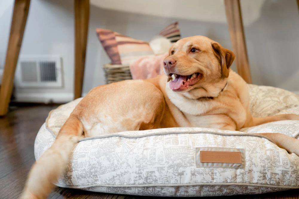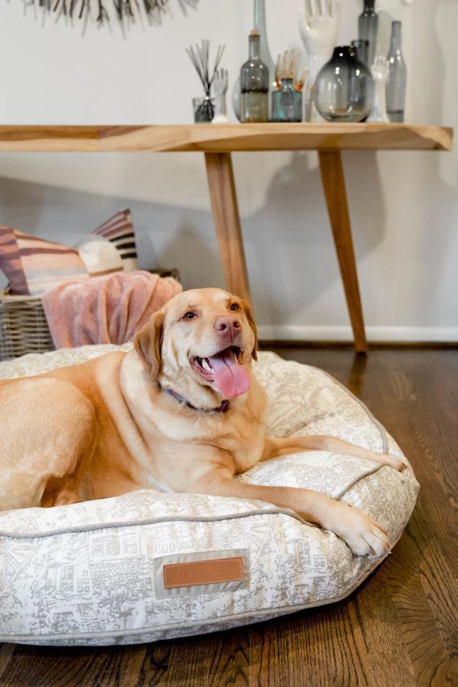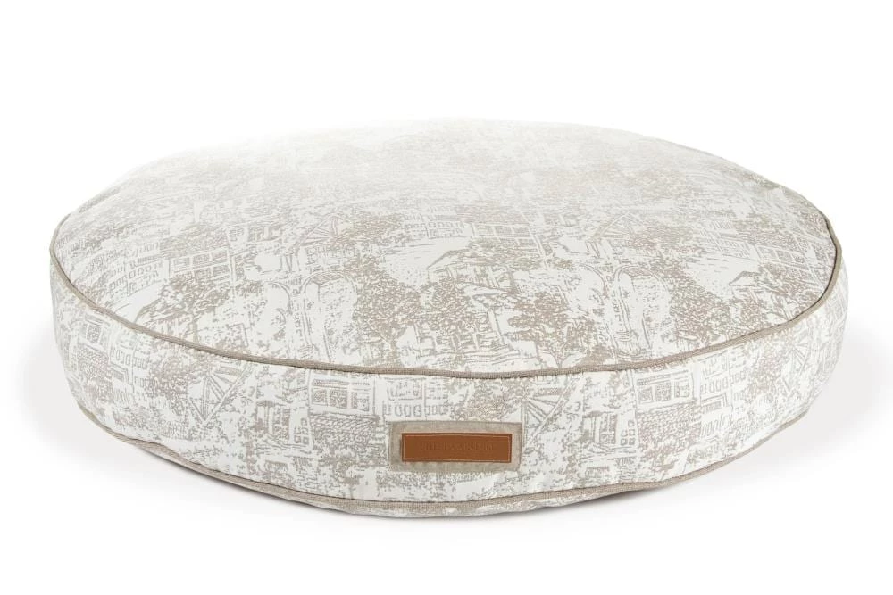 Have a dog who’s a freestyle sleeper? On their back one minute, belly the next, curled into a donut a minute later? Our round bed takes on all comers. Plush and responsive, the Round bed refuses to clump or flatten. It’s over-stuffed with a proprietary fill made from recycled plastic water bottles that gives just the right amount to provide support and bounces back use after use. Beautifully tailored in an oatmeal colored Sunbrella fabric, with a classic toile pattern, that is soft to the touch, durable, resists moisture, and is washable. There is simply no better fabric choice for a pet bed. Each piece is made by hand in the USA and begins manufacturing the day you place your order. Thoughtfully designed with your dog and your home in mind, our round bed performs as good as it looks.??We recommend measuring your sleeping pet to find the perfect bed size. Pets who curl up to sleep can fit on a smaller bed, while those who stretch out need a larger bed. To determine the ideal bed length, measure your pet in their typical sleeping position, then add 6-10” for the final bed size. When in doubt, we suggest ordering the size up. Please double check that you have chosen the correct size before placing your order.??Small: 24 in. x 24 in. x 8 in. high (dogs less than 30 lbs)?Medium: 31 in. x 31 in. x 8 in. high (dogs 30-60 lbs)?Large: 41 in. x 41 in. x 10 in. high (dogs 60-90 lbs)?X-Large: 48 in. x 48 in. x 11 in. high (dogs over 90 lbs)