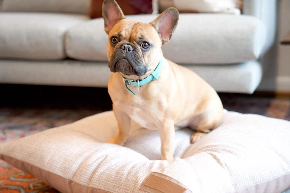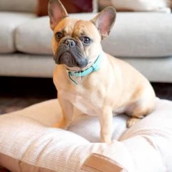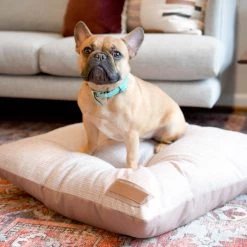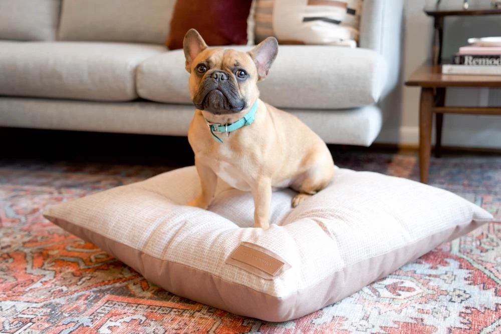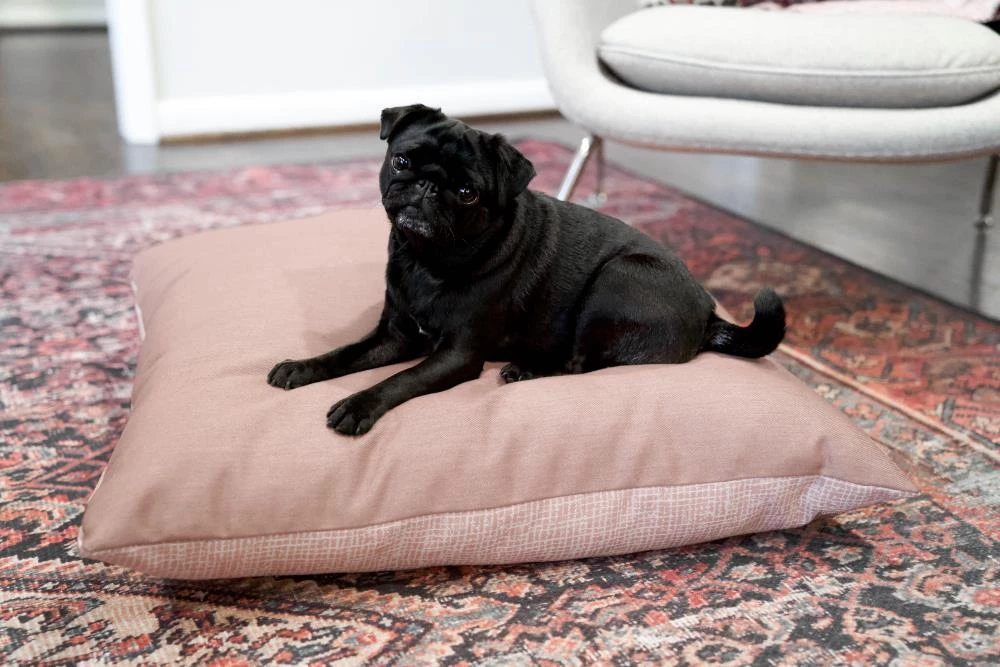 Treat your pooch to the most comfortable seat in the house. Your furry family members can sprawl, curl, lounge, and sleep to their heart’s content. Our pillow beds are over-stuffed with a proprietary fill made from recycled plastic water bottles that gives just the right amount to provide support and bounces back use after use. Tailored in beautiful blush Sunbrella fabrics, with a modern textured pattern, that are soft to the touch, durable, resist moisture, and are washable. There is simply no better fabric choice for a pet bed. Each piece is made by hand in the USA and begins manufacturing the day you place your order. Thoughtfully designed with your dog and your home in mind, our pillow bed performs as good as it looks.??We recommend measuring your sleeping pet to find the perfect bed size. Pets who curl up to sleep can fit on a smaller bed, while those who stretch out need a larger bed. To determine the ideal bed length, measure your pet in their typical sleeping position, then add 6-10” for the final bed size. When in doubt, we suggest ordering the size up. Please double check that you have chosen the correct size before placing your order.??Small: 25 in. x 25 in. x 8 in. high (dogs less than 30 lbs)?Medium: 38 in. x 29 in. x 10 in. high (dogs 30-60 lbs)?Large: 47 in. x 37 in. x 10 in. high (dogs 60-90 lbs)