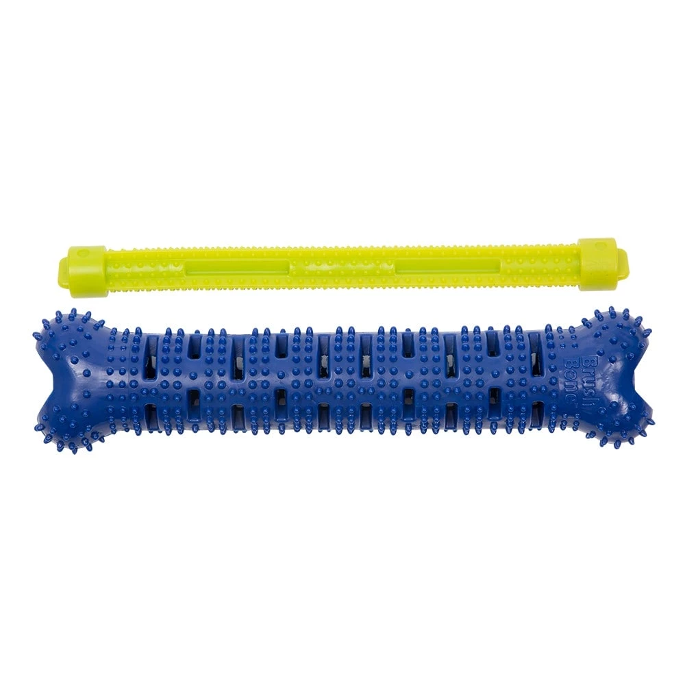 The Brush Bone cleans dogs’ teeth and gums in three different ways. The tooth-shaped openings gently scrape away plaque and tarter from your dog’s teeth. The hidden bristles brush your pet’s teeth clean while they play. It even massages their gums. The more they chew, the cleaner their teeth! For best results, we recommend a using a new Brush Bone™ once a month or when it starts to show signs of wear!