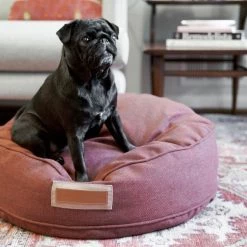 Have a dog who’s a freestyle sleeper? On their back one minute, belly the next, curled into a donut a minute later? Our round bed takes on all comers. Plush and responsive, the Round bed refuses to clump or flatten. It’s over-stuffed with a proprietary fill made from recycled plastic water bottles that gives just the right amount to provide support and bounces back use after use. Tailored in a beautifully textured russett Sunbrella fabric that is soft to the touch, durable, resists moisture, and is washable. There is simply no better fabric choice for a pet bed. Each piece is made by hand in the USA and begins manufacturing the day you place your order. Thoughtfully designed with your dog and your home in mind, our round bed performs as good as it looks.??We recommend measuring your sleeping pet to find the perfect bed size. Pets who curl up to sleep can fit on a smaller bed, while those who stretch out need a larger bed. To determine the ideal bed length, measure your pet in their typical sleeping position, then add 6-10” for the final bed size. When in doubt, we suggest ordering the size up. Please double check that you have chosen the correct size before placing your order.??Small: 24 in. x 24 in. x 8 in. high (dogs less than 30 lbs)?Medium: 31 in. x 31 in. x 8 in. high (dogs 30-60 lbs)?Large: 41 in. x 41 in. x 10 in. high (dogs 60-90 lbs)?X-Large: 48 in. x 48 in. x 11 in. high (dogs over 90 lbs)