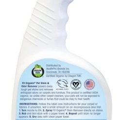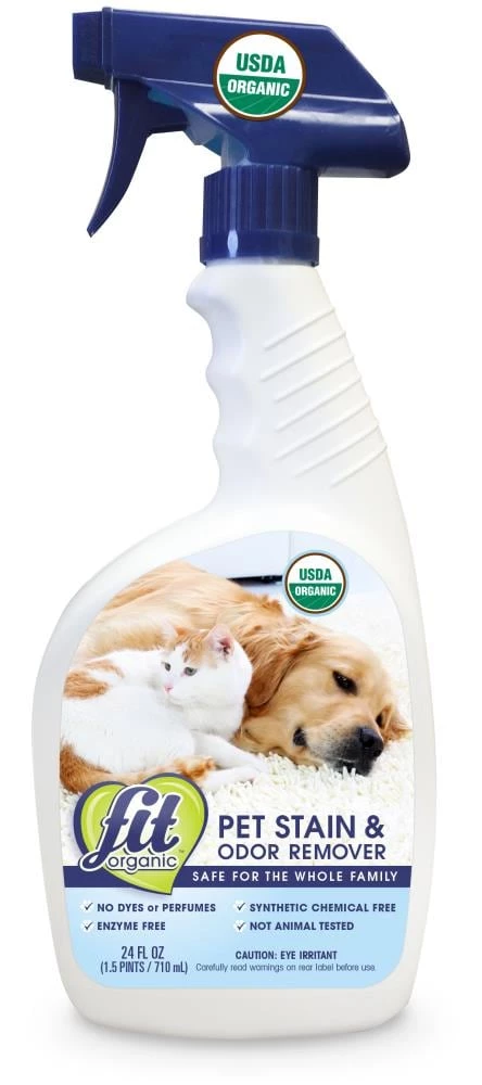 FIT Organic pet stain and odor remover powers away tough stains and removes entrapped odors on carpets and furniture safely and organically. This product is certified USDA organic, so unlike other carpet cleaners, your pet will not be exposed to dangerous chemicals or fumes that could be risky to their health.