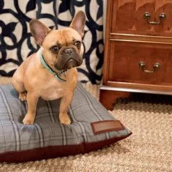 Treat your pooch to the most comfortable seat in the house. Your furry family members can sprawl, curl, lounge, and sleep to their heart’s content. Our pillow beds are over-stuffed with a proprietary fill made from recycled plastic water bottles that gives just the right amount to provide support and bounces back use after use. Tailored in menswear inspired gray and russett Sunbrella fabrics, with a vintage plaid pattern, that are soft to the touch, durable, resist moisture, and are washable. There is simply no better fabric choice for a pet bed. Each piece is made by hand in the USA and begins manufacturing the day you place your order. Thoughtfully designed with your dog and your home in mind, our pillow bed performs as good as it looks.??We recommend measuring your sleeping pet to find the perfect bed size. Pets who curl up to sleep can fit on a smaller bed, while those who stretch out need a larger bed. To determine the ideal bed length, measure your pet in their typical sleeping position, then add 6-10” for the final bed size. When in doubt, we suggest ordering the size up. Please double check that you have chosen the correct size before placing your order.??Small: 25 in. x 25 in. x 8 in. high (dogs less than 30 lbs)?Medium: 38 in. x 29 in. x 10 in. high (dogs 30-60 lbs)?Large: 47 in. x 37 in. x 10 in. high (dogs 60-90 lbs)