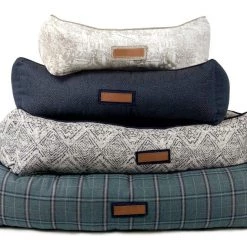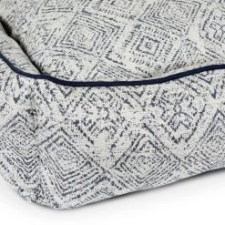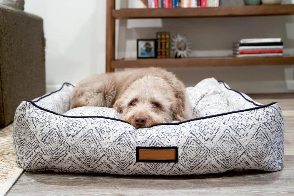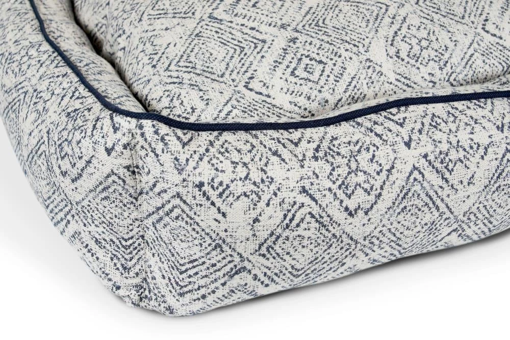 Snuggle much? For dogs that love to burrow behind cushions on the sofa, or disappear under the blankets on the bed, the Hugger makes a wonderful choice. Bolstered on all four sides, your hound is sure to find a comfortable corner to snuggle up to. The Hugger is our fluffiest, coziest bed. It’s over-stuffed with a proprietary fill made from recycled plastic water bottles that gives just the right amount to provide support and bounces back use after use. Sewn in a deep indigo Sunbrella fabric, with a distressed diamond pattern, that is soft to the touch, durable, resists moisture, and is washable. There is simply no better fabric choice for a pet bed. Each piece is made by hand in the USA and begins manufacturing the day you place your order. Thoughtfully designed with your dog and your home in mind, the Hugger bed performs as good as it looks.??We recommend measuring your sleeping pet to find the perfect bed size. Pets who curl up to sleep can fit on a smaller bed, while those who stretch out need a larger bed. To determine the ideal bed length, measure your pet in their typical sleeping position, then add 6-10” for the final bed size. When in doubt, we suggest ordering the size up. Please double check that you have chosen the correct size before placing your order.??Small: 24 in. x 18 in. x 7 in. high (dogs less than 30 lbs)?Medium: 30 in. x 25 in. x 8 in. high (dogs 30-60 lbs)?Large: 38 in. x 25 in. x 8 in. high (dogs 60-90 lbs)?X-Large: 44 in. x 36 in. x 10 in. high (dogs over 90 lbs)