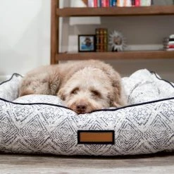 Snuggle much? For dogs that love to burrow behind cushions on the sofa, or disappear under the blankets on the bed, the Hugger makes a wonderful choice. Bolstered on all four sides, your hound is sure to find a comfortable corner to snuggle up to. The Hugger is our fluffiest, coziest bed. It’s over-stuffed with a proprietary fill made from recycled plastic water bottles that gives just the right amount to provide support and bounces back use after use. Sewn in a deep indigo Sunbrella fabric, with a distressed diamond pattern, that is soft to the touch, durable, resists moisture, and is washable. There is simply no better fabric choice for a pet bed. Each piece is made by hand in the USA and begins manufacturing the day you place your order. Thoughtfully designed with your dog and your home in mind, the Hugger bed performs as good as it looks.??We recommend measuring your sleeping pet to find the perfect bed size. Pets who curl up to sleep can fit on a smaller bed, while those who stretch out need a larger bed. To determine the ideal bed length, measure your pet in their typical sleeping position, then add 6-10” for the final bed size. When in doubt, we suggest ordering the size up. Please double check that you have chosen the correct size before placing your order.??Small: 24 in. x 18 in. x 7 in. high (dogs less than 30 lbs)?Medium: 30 in. x 25 in. x 8 in. high (dogs 30-60 lbs)?Large: 38 in. x 25 in. x 8 in. high (dogs 60-90 lbs)?X-Large: 44 in. x 36 in. x 10 in. high (dogs over 90 lbs)