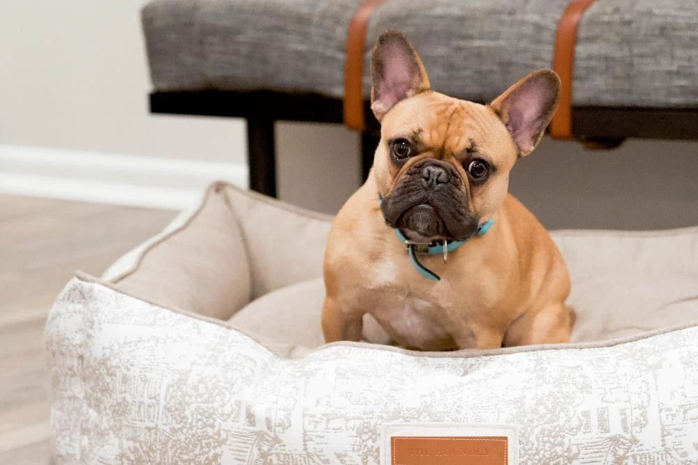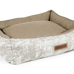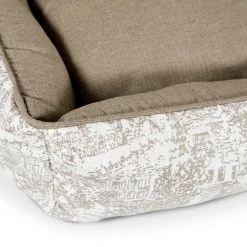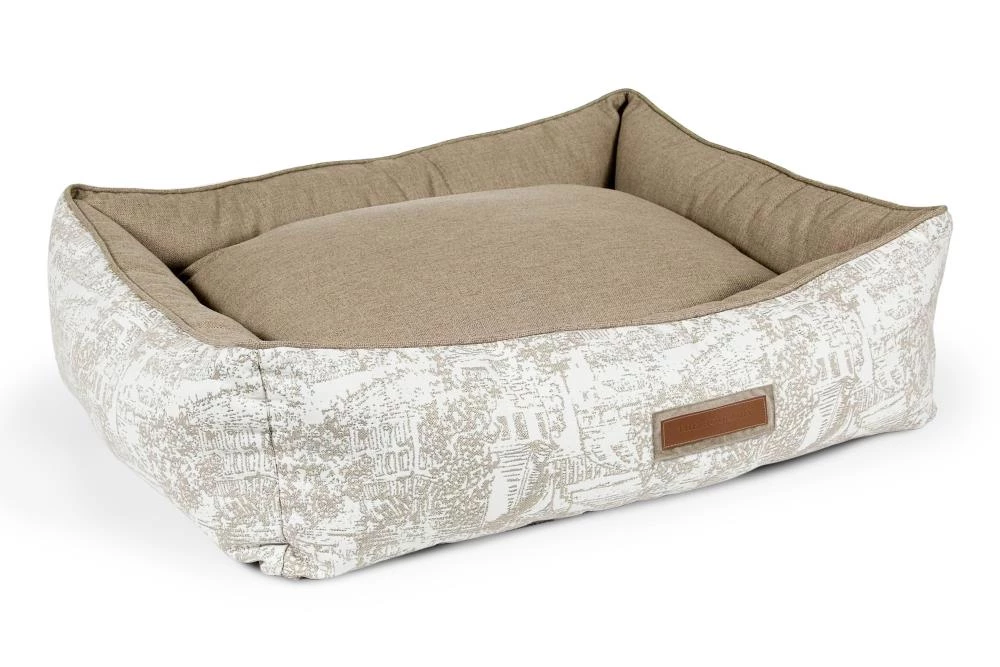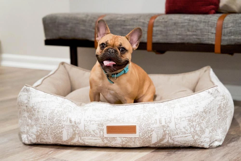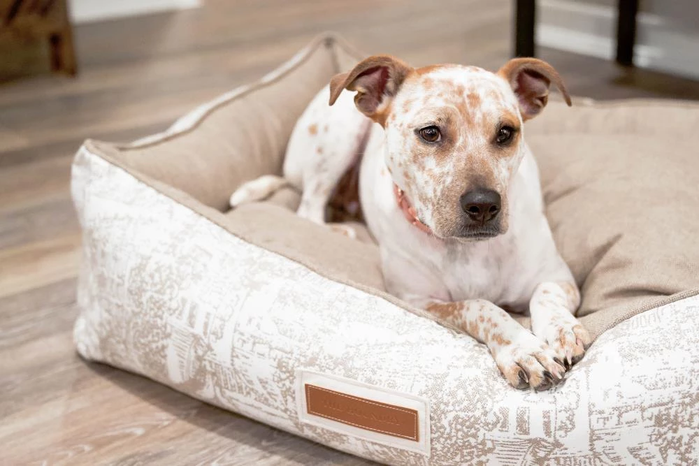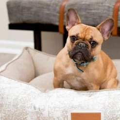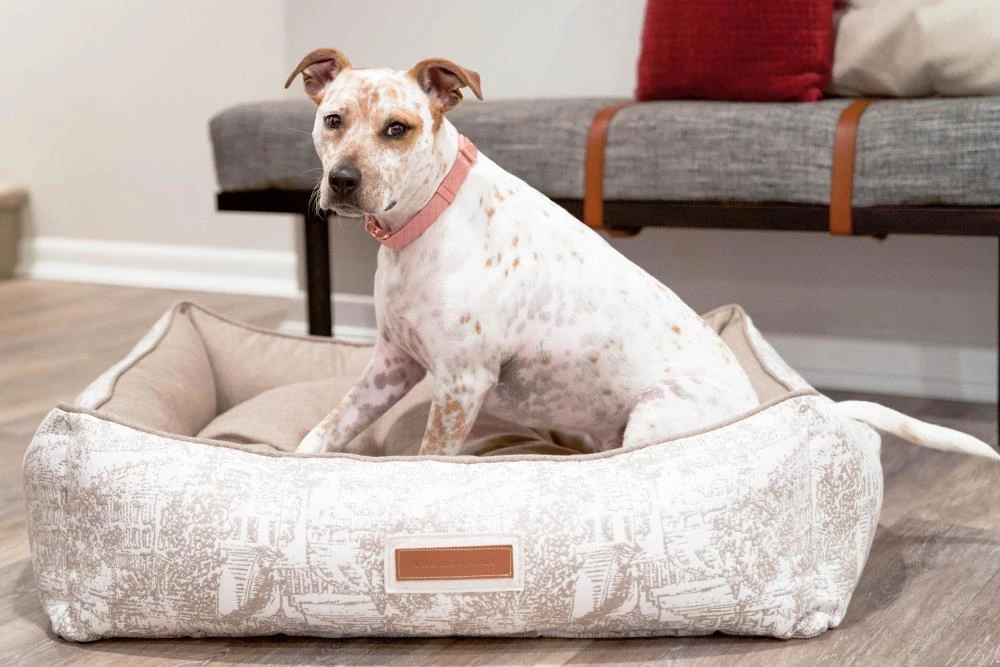 Snuggle much? For dogs that love to burrow behind cushions on the sofa, or disappear under the blankets on the bed, the Hugger makes a wonderful choice. Bolstered on all four sides, your hound is sure to find a comfortable corner to snuggle up to. The Hugger is our fluffiest, coziest bed. It’s over-stuffed with a proprietary fill made from recycled plastic water bottles that gives just the right amount to provide support and bounces back use after use. Sewn in beautiful oatmeal Sunbrella fabrics, with a classic toile pattern, that are soft to the touch, durable, resist moisture, and are washable. There is simply no better fabric choice for a pet bed. Each piece is made by hand in the USA and begins manufacturing the day you place your order. Thoughtfully designed with your dog and your home in mind, the Hugger bed performs as good as it looks.??We recommend measuring your sleeping pet to find the perfect bed size. Pets who curl up to sleep can fit on a smaller bed, while those who stretch out need a larger bed. To determine the ideal bed length, measure your pet in their typical sleeping position, then add 6-10” for the final bed size. When in doubt, we suggest ordering the size up. Please double check that you have chosen the correct size before placing your order.??Small: 24 in. x 18 in. x 7 in. high (dogs less than 30 lbs)?Medium: 30 in. x 25 in. x 8 in. high (dogs 30-60 lbs)?Large: 38 in. x 25 in. x 8 in. high (dogs 60-90 lbs)?X-Large: 44 in. x 36 in. x 10 in. high (dogs over 90 lbs)