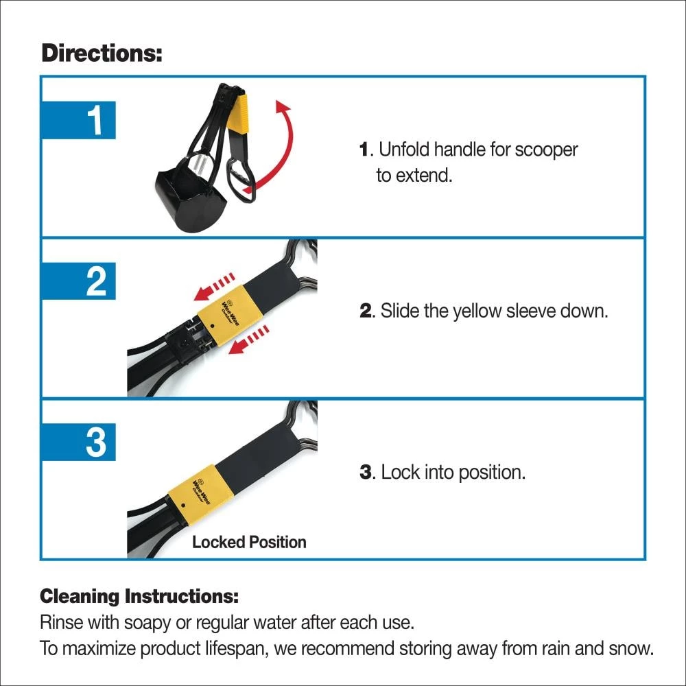 - Folding pooper scooper extends over 2 feet tall to avoid uncomfortable bending and easily folds for compact storage