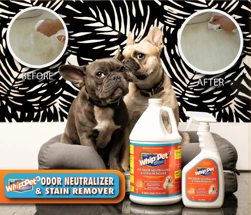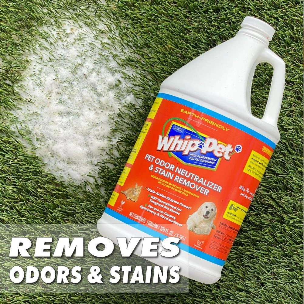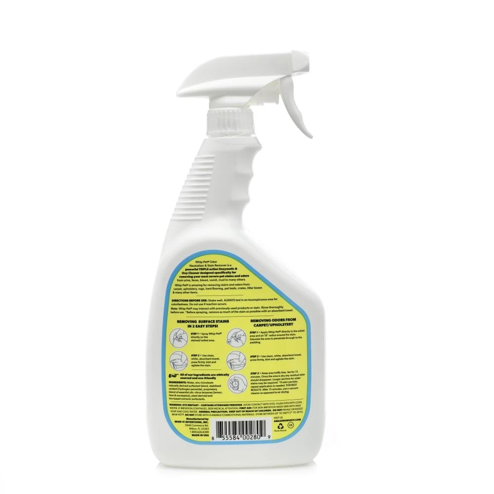 Whip Pet is a dual action, enzymatic and oxygen based formula that pushes plant based technology to the limits! Whip Pet incredibly eliminates stains and odors from urine, diarrhea, organic stain, vomit, feces, blood, mud, grease and many more! Whip Pet powerfully refreshes pet beds, furniture, crates, litter boxes, hamster cages, automobiles.