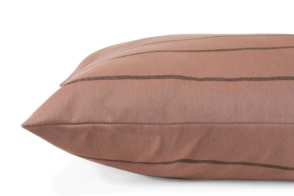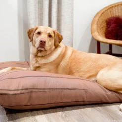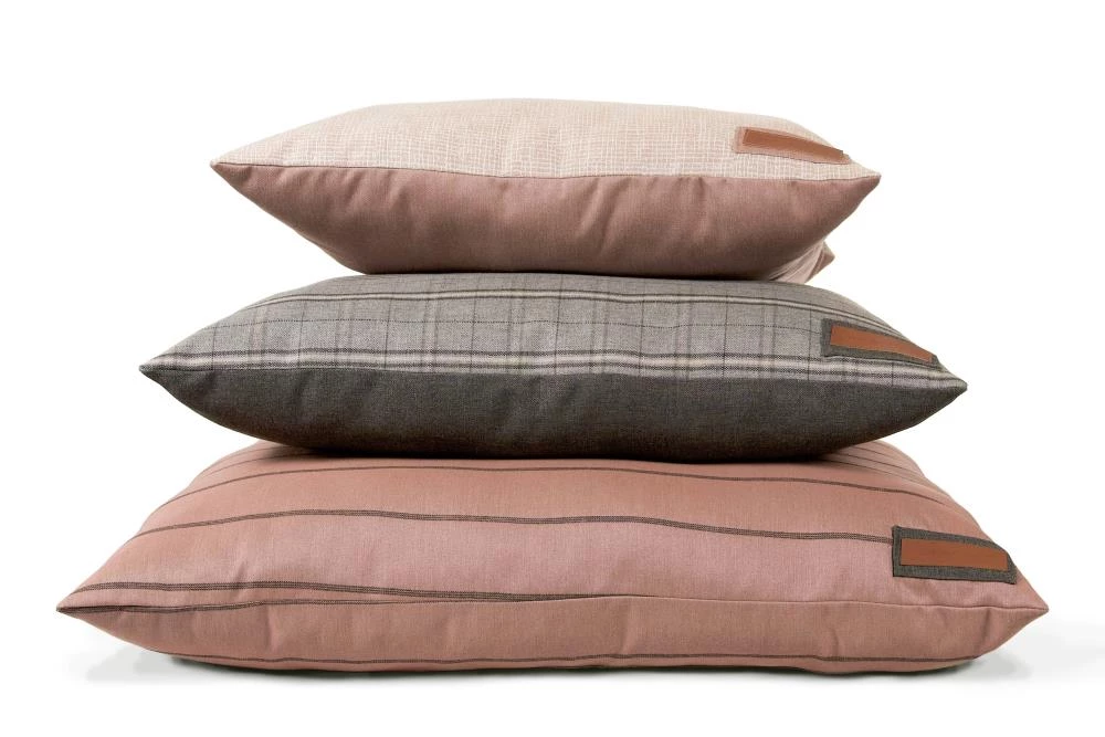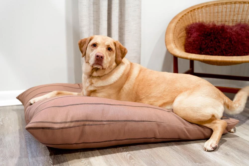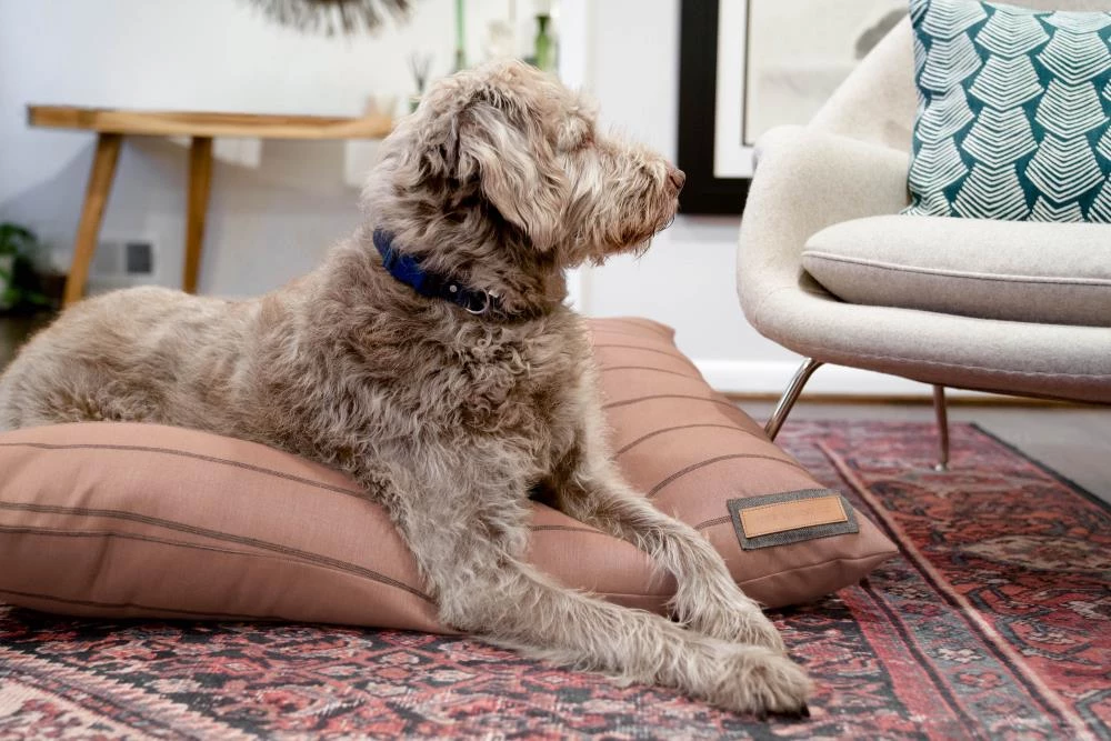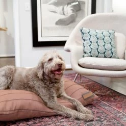 Treat your pooch to the most comfortable seat in the house. Your furry family members can sprawl, curl, lounge, and sleep to their heart’s content. Our pillow beds are over-stuffed with a proprietary fill made from recycled plastic water bottles that gives just the right amount to provide support and bounces back use after use. Tailored in a beautiful blush Sunbrella fabric, with a contrasting ticking stripe, that is soft to the touch, durable, resists moisture, and is washable. There is simply no better fabric choice for a pet bed. Each piece is made by hand in the USA and begins manufacturing the day you place your order. Thoughtfully designed with your dog and your home in mind, our pillow bed performs as good as it looks.??We recommend measuring your sleeping pet to find the perfect bed size. Pets who curl up to sleep can fit on a smaller bed, while those who stretch out need a larger bed. To determine the ideal bed length, measure your pet in their typical sleeping position, then add 6-10” for the final bed size. When in doubt, we suggest ordering the size up. Please double check that you have chosen the correct size before placing your order.??Small: 25 in. x 25 in. x 8 in. high (dogs less than 30 lbs)?Medium: 38 in. x 29 in. x 10 in. high (dogs 30-60 lbs)?Large: 47 in. x 37 in. x 10 in. high (dogs 60-90 lbs)